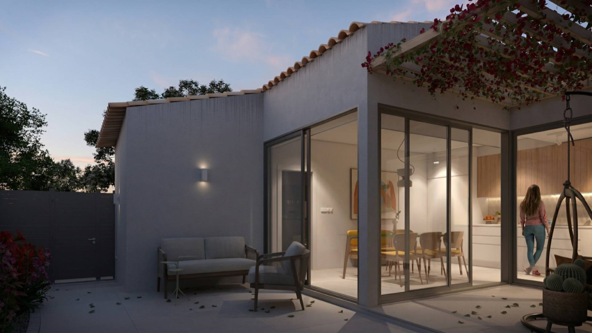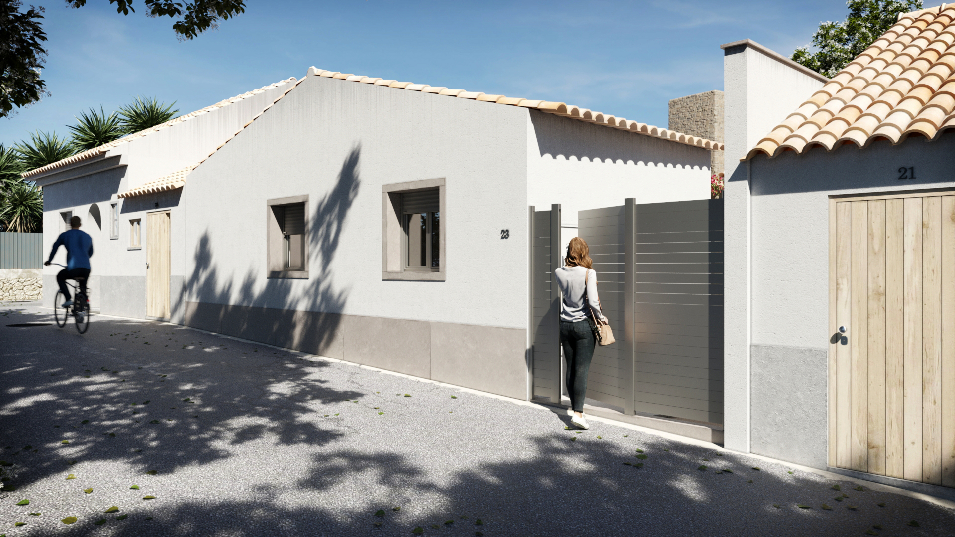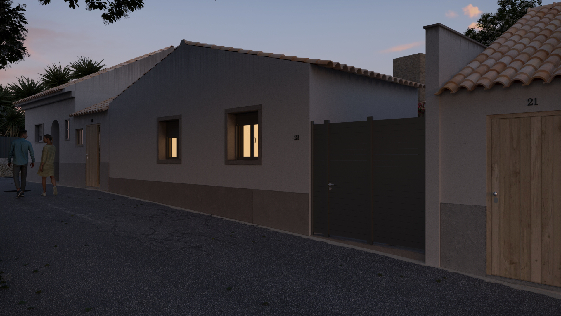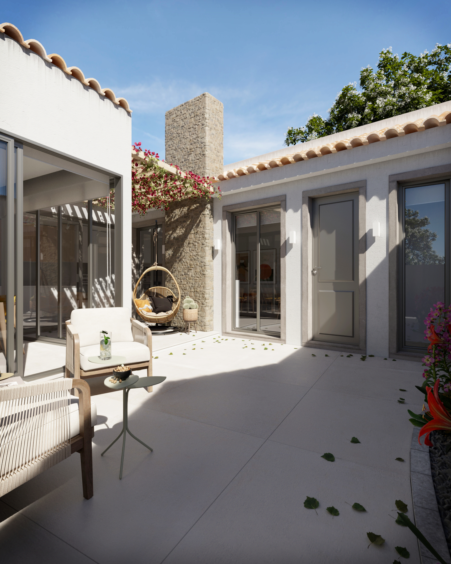 Mais do que representar a arquitetura, o objetivo foi construir uma narrativa visual que transmitisse a forma como a casa é habitada: momentos de sombra no alpendre, a luz filtrada pela pérgola e a ligação natural entre os diferentes espaços da casa.