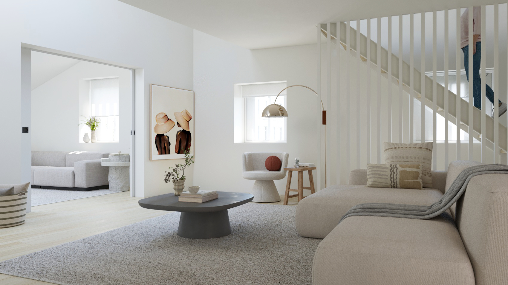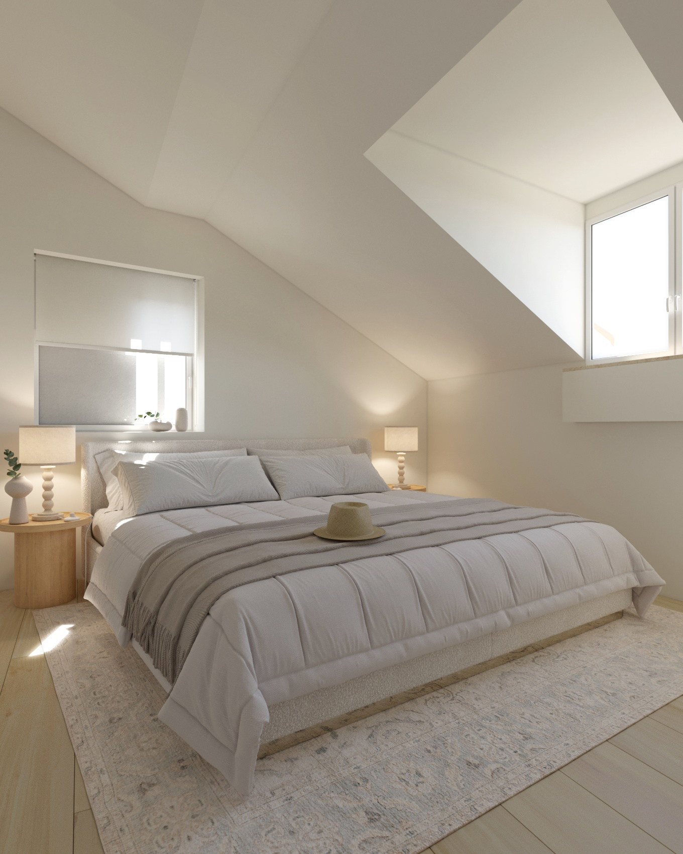 A estratégia de comunicação visual deste projeto centra-se na valorização da reabilitação e da transformação espacial, destacando o aproveitamento do pé-direito elevado através da introdução da mezzanine.