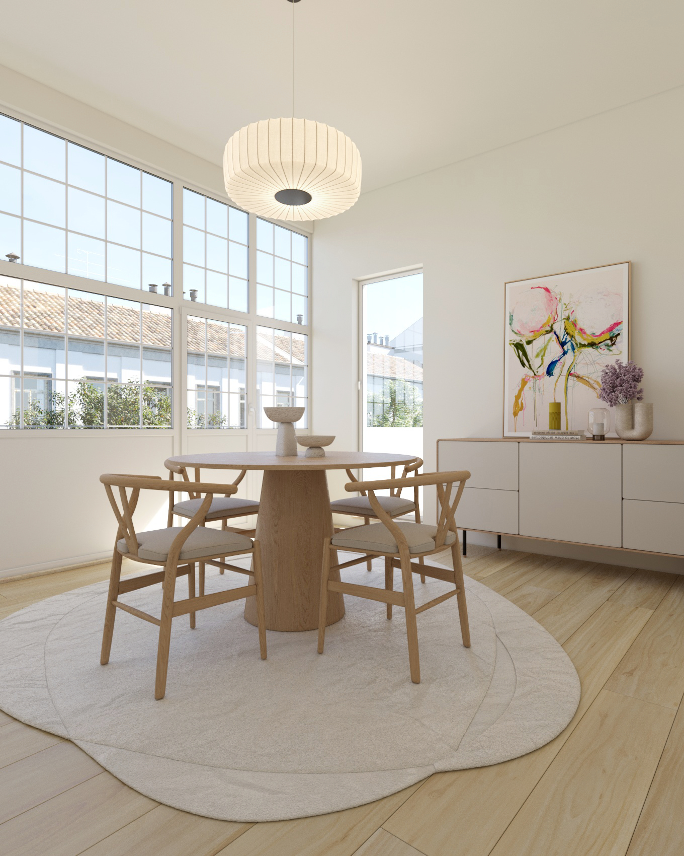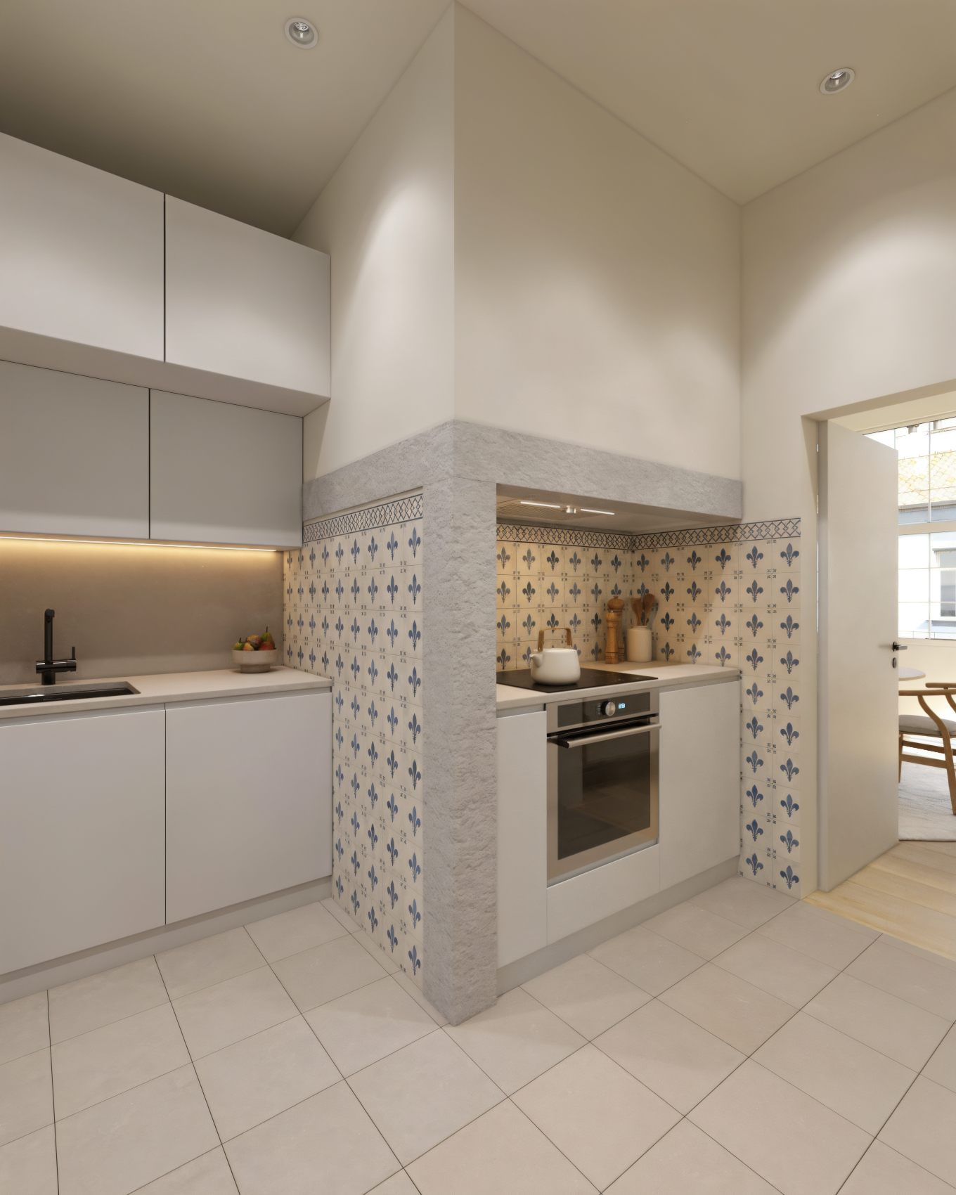 A chaminé original surge como elemento identitário, contrastando com a linguagem moderna e clean adotada. As imagens privilegiam a entrada de luz natural, a leveza dos materiais e a fluidez entre espaços, comunicando um ambiente contemporâneo, funcional e com carácter, pensado para um estilo de vida urbano e sofisticado.